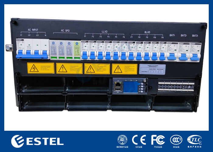 O painel de distribuição de corrente contínua é equipado com interruptores de bateria 3*125A/1P e inclui umLLVD e aFuncionalidade BLVD para gestão de energia segura e flexível.e 8 relés de alarme de contacto seco configuráveisO monitoramento e a gestão remotos são habilitados através de interfaces RS232/485 e SNMP, enquanto um ecrã LCD integrado permite a visualização e configuração do estado local.